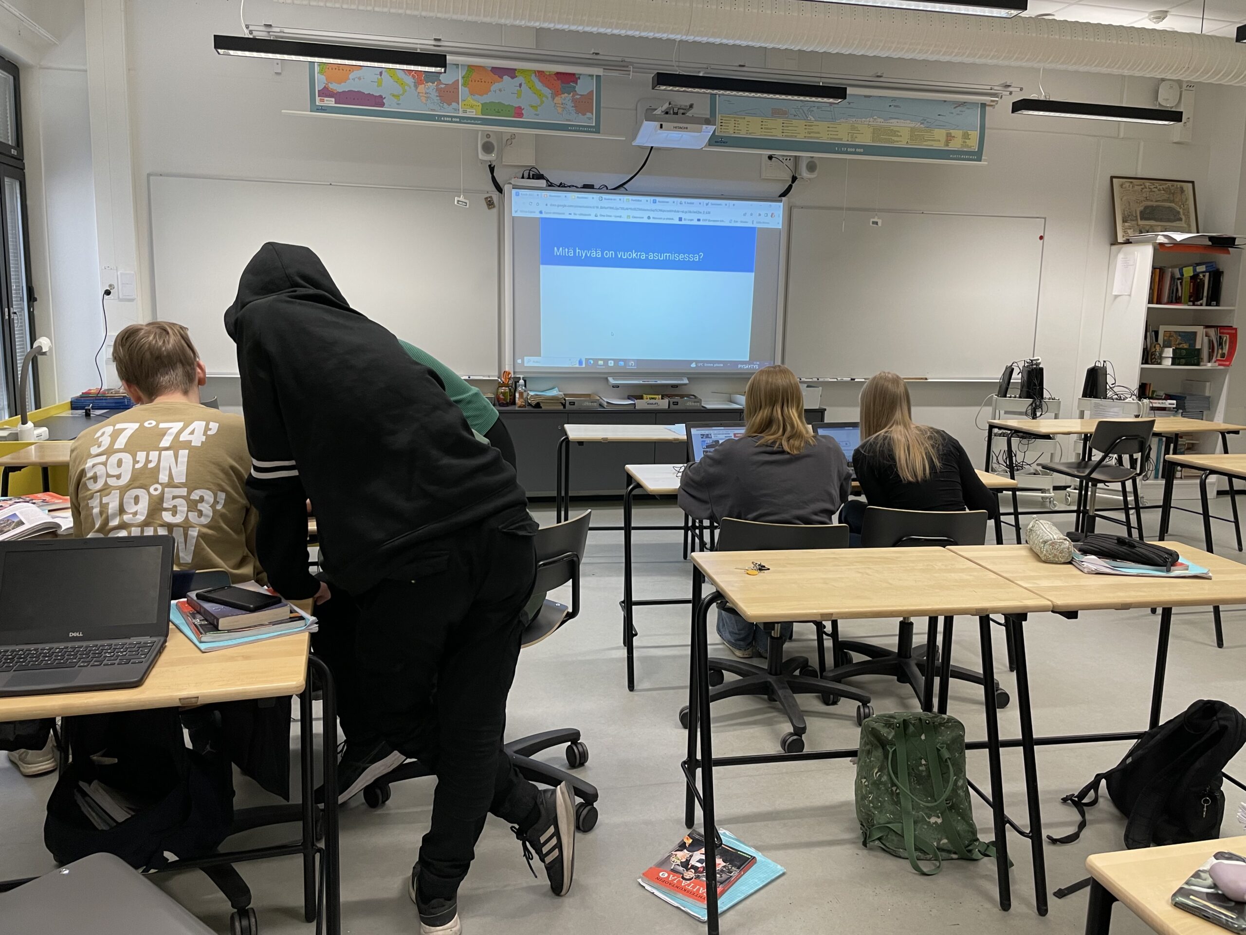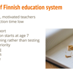 Po hodině si ptám, jestli se úkol z reálného života zadává vždy. Riitta mi vysvětluje, že téměř vždy, protože jinak to děti nebudou považovat za užitečný předmět. A ptám se na kritické myšlení? Riitta místo odpovědi otevírá jinou prezentaci, jen pro mě. Po volbách, které se konaly 2 týdny před naší návštěvou a ve kterých se na 2. místě umístili populisté, zadala dětem úkol, aby zjistily, jaké kandidáty jednotlivé strany postavily, jak se umístily strany, ale také, kdo je dle výzkumů volil. „Víte, tyhle děti taky fandí populistům, ale když si samy zjistily, že je volili méně vzdělaní občané, nebylo jim to příjemné. Taky musíme donutit naše mladé přemýšlet.“