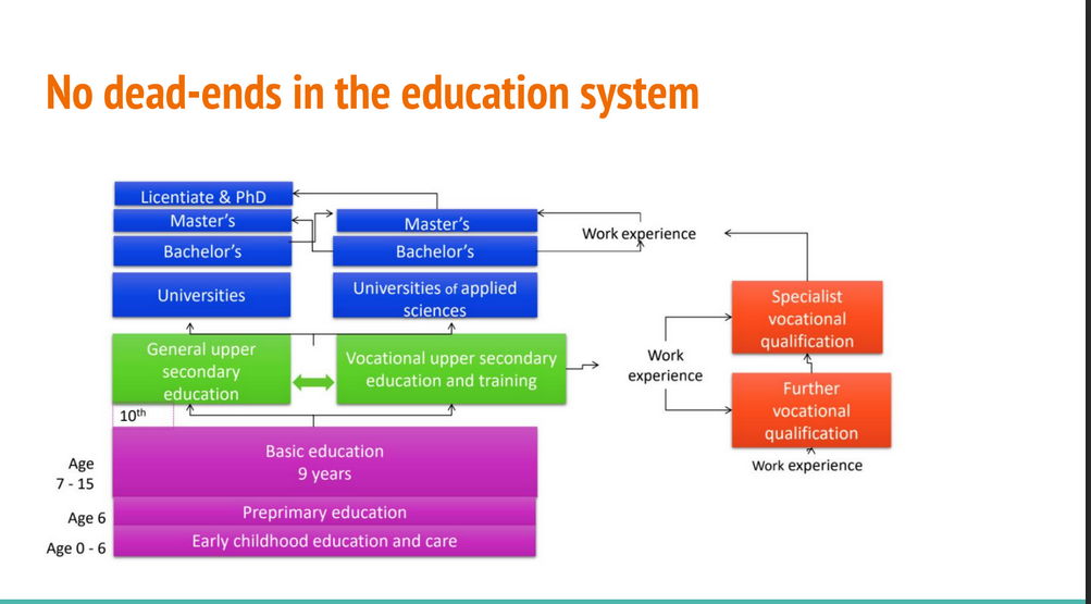 Další den jdete navštívit první ze třech škol. Zjistíte, že nedávno proběhla reorganizace systému. Finové začínají povinnou docházku již v předškolním věku a končí v 18. Primární vzdělávání obsahuje 9 tříd, tedy jako u nás. (V tom je ta změna, před pár lety 7. – 9. ročník byly součástí sekundárního vzdělávání.) Po devítce tedy děti pokračují buď ve všeobecném vzdělávání nebo odborném. Ale jak sami Finové zdůrazňují, v jejich systému nejsou „slepé uličky“, jejich systém je prostupný. A tak i z učiliště můžete jít na vysokou školu – samozřejmě pokud „pásnete přijímačky“. Oni sami svou výlučnost vidí v následujícím:
